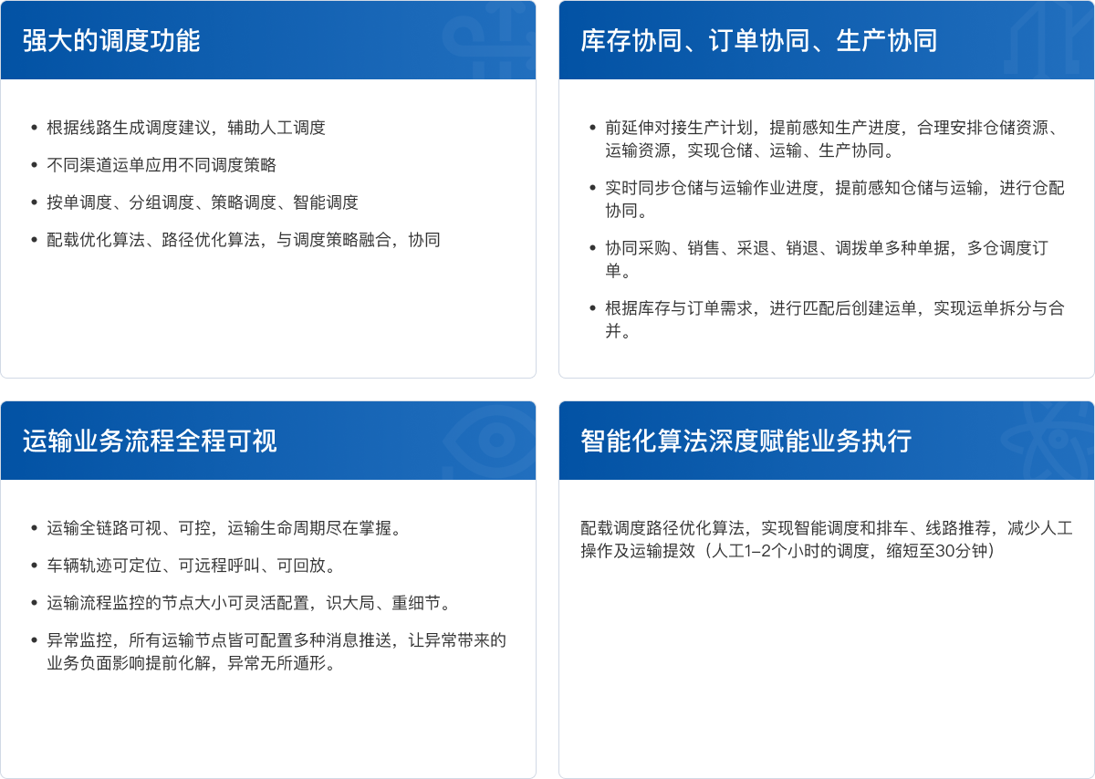 智慧運輸TMS是企業(yè)運輸管理的大腦,面向運單管理,運輸計劃,調(diào)度管理,運輸管理,在途管理,車隊管理,承運商詢報價,供應(yīng)商考核,國際出口業(yè)務(wù),國際進口業(yè)務(wù)等。產(chǎn)品集成運輸業(yè)務(wù)具體應(yīng)用場景的算法服務(wù),如裝載優(yōu)化,車輛路徑優(yōu)化算法,可進一步提升運輸效率,降低運輸成本。